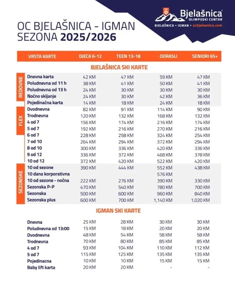 Na Bjelašnici će cijena dnevne karte za odrasle biti 59 KM i skuplja je za 10 KM u odnosu na prošlu sezonu. Poskupjela je i karta za djecu i tinejdžere za sedam, odnosno, osam KM te će za djecu do 12 godina sada dnevna karta iznositi 42 KM, a za tinejdžere od 13 do 18 godina 47 KM.