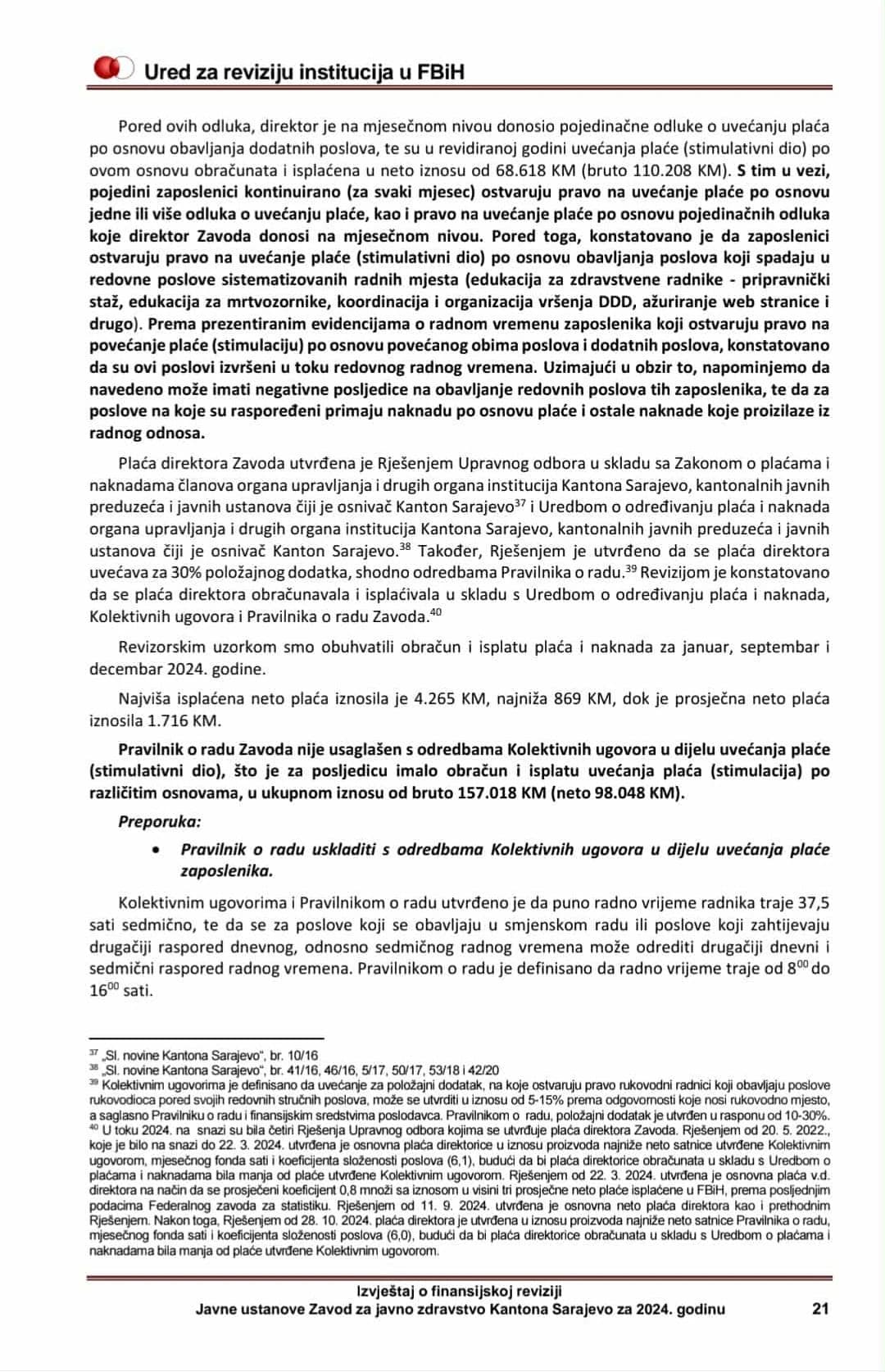 Revizori Ured za reviziju institucija Federacije Bosne i Hercegovine utvrdili su da Pravilnik o radu, unutrašnjoj organizaciji i sistematizaciji radnih mjesta, plaćama i naknadama radnika Zavoda za javno zdravstvo Kantona Sarajevo nije usklađen sa doredbama kolektivnim ugovorima radnika u dijelu uvećanja plaća (stimulativni dio).