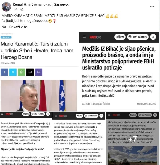 NiP-ov ministar Kemal Hrnjić, umjesto da odgovori na zastupničko, kao i pitanje novinara Faktora u vezi sa poticajima, "mahalao" je i piskarao po Facebooku iznoseći neprimjerene komentare poput "Mario Karamatić brani Medžlis Islamske zajednice Bihać, pa ljudi je li to mogućeeee"...