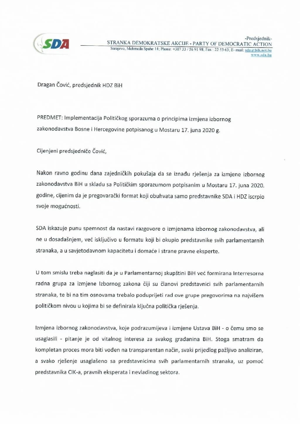 U prilog dopisu je Izetbegović dostavio i osvrt SDA na HDZ-ov prijedlog izmjena Ustava i Izbornog zakona BiH, sa detaljnim obrazloženjem zbog čega su dijelovi tog prijedloga neprihvatljivi, te SDA-ov prijedlog za implementaciju Političkog sporazuma iz Mostara.