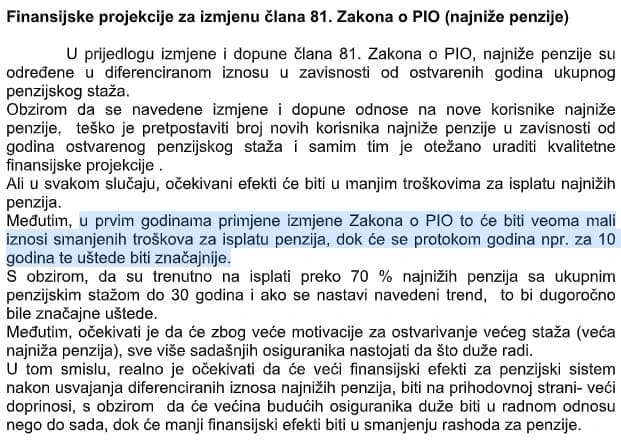 U finansijskoj projekciji Federalnog ministarstva rada i socijalne politike stoji kako će u prvim godina primjene izmjena Zakona o PIO-u u članu 81. biti veoma mali iznosi smanjenih troškova za isplatu penzija, dok će "protokom godina, npr. za 10 godina te uštede biti značajnije".