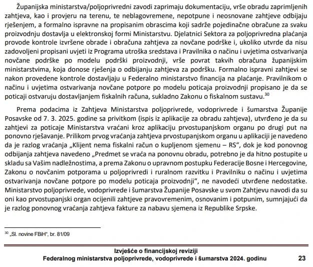 - Prema podacima iz zahtjeva Ministarstva poljoprivrede, vodoprivrede i šumarstva Posavkog kantona od 07.3.2025. godine utvrđeno je da su zahtjevi za poticaje Ministarstva vraćani kroz aplikaciju prvostepenom organu, drugi put, na ponovno rješavanje. Prilikom prvog vraćanja zahtjeva navedeno je da je razlog vraćanja da "Klijent nema fiskalni račun o kupljenom sjemenu u RS-u", dok je kod ponovnog odbijanja zahtjeva navedeno "Predmet se vraća na ponovnu obradu, potrebno je da hitno postupite u skladu sa vašim nadležnostima, a prema Zakonu o upravnom postupku FBiH, Zakonu o novčanim poticajima u poljoprivredi i ruralnom razvitku i Pravilniku o načinu i uvjetima ostvarivanja novčane podrške po modelu poticaja proizvodnji", ne navodeći utvrđene nedostatke - stoji u revizorskom izvještaju i dodaje: