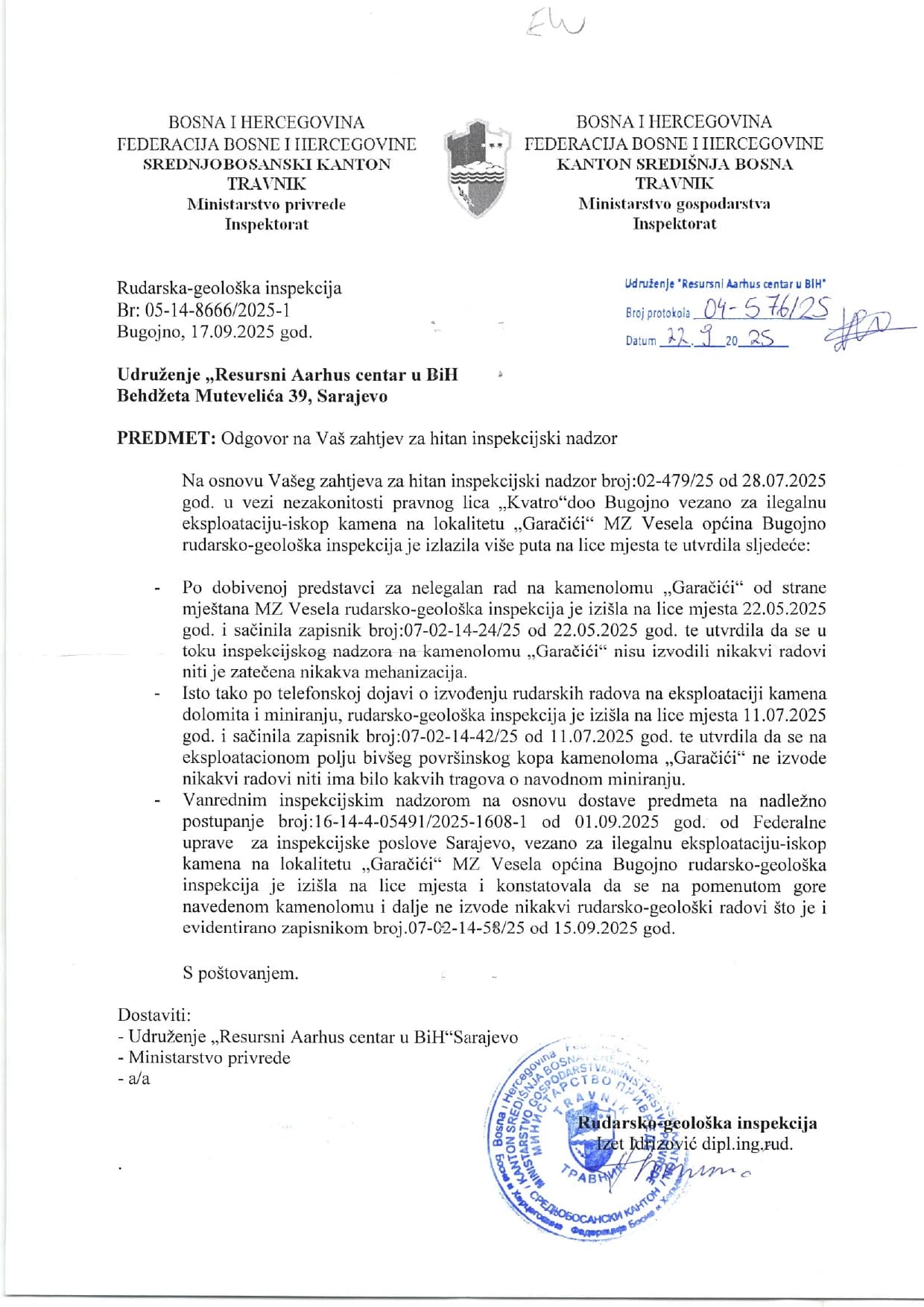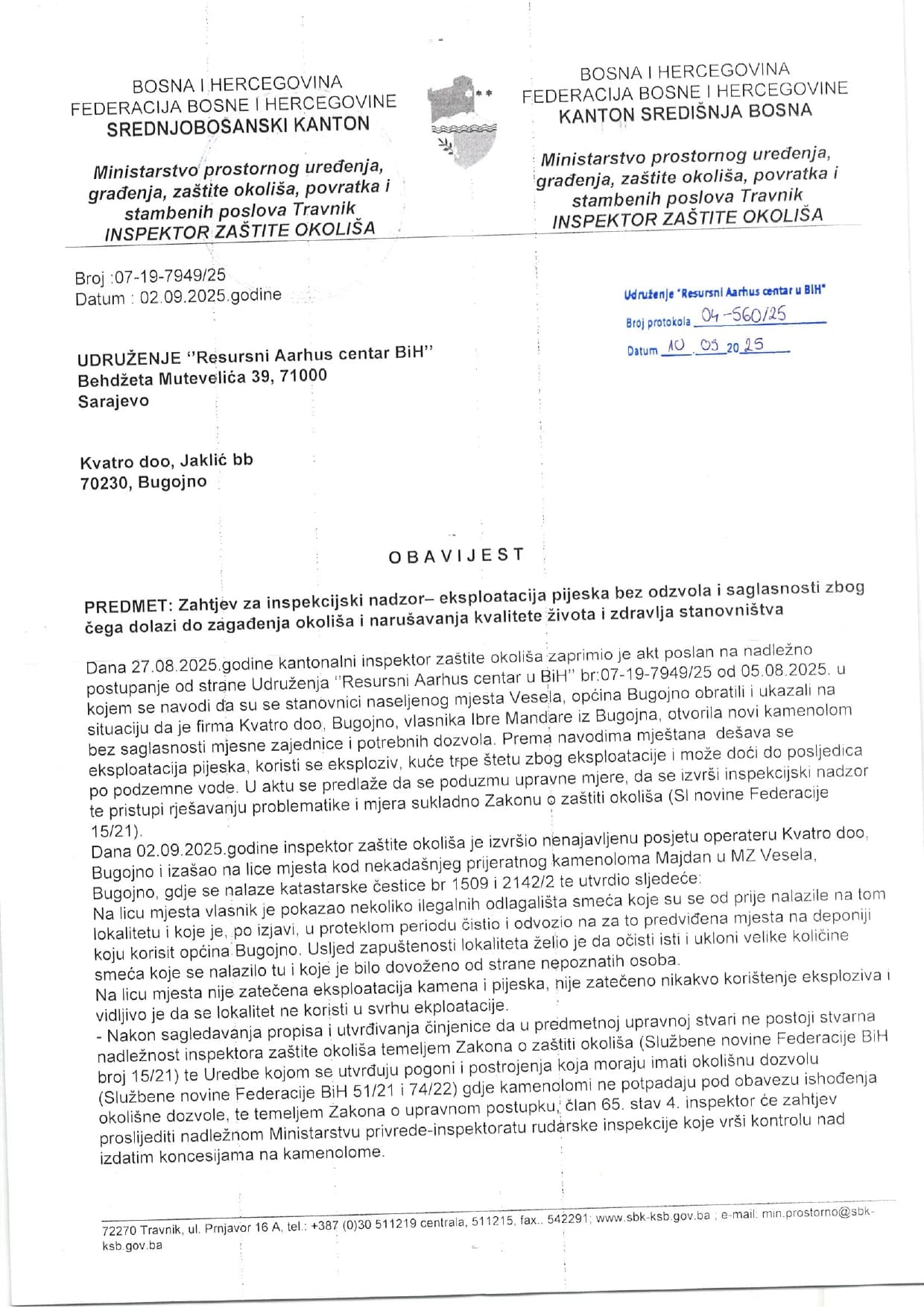 - Opisano stanje načina održavanja javnih rasprava je nažalost, prema iskustvu Aarhus centra u BiH (a koje sada ima preko 13 godina rada na terenu), česta pojava. Mnogi okolišni problemi i prijetnje bivaju riješeni na ovaj način. Ono što je problematično za ovaj slučaj jeste da lokacija, obim i prisustvo otvaranja starog-novog kamenoloma uz postojanje podzemih voda, može potencijalno izazvati scenarij sličan kao onaj u Donjoj Jablanici - ističu iz Aarhus centra.