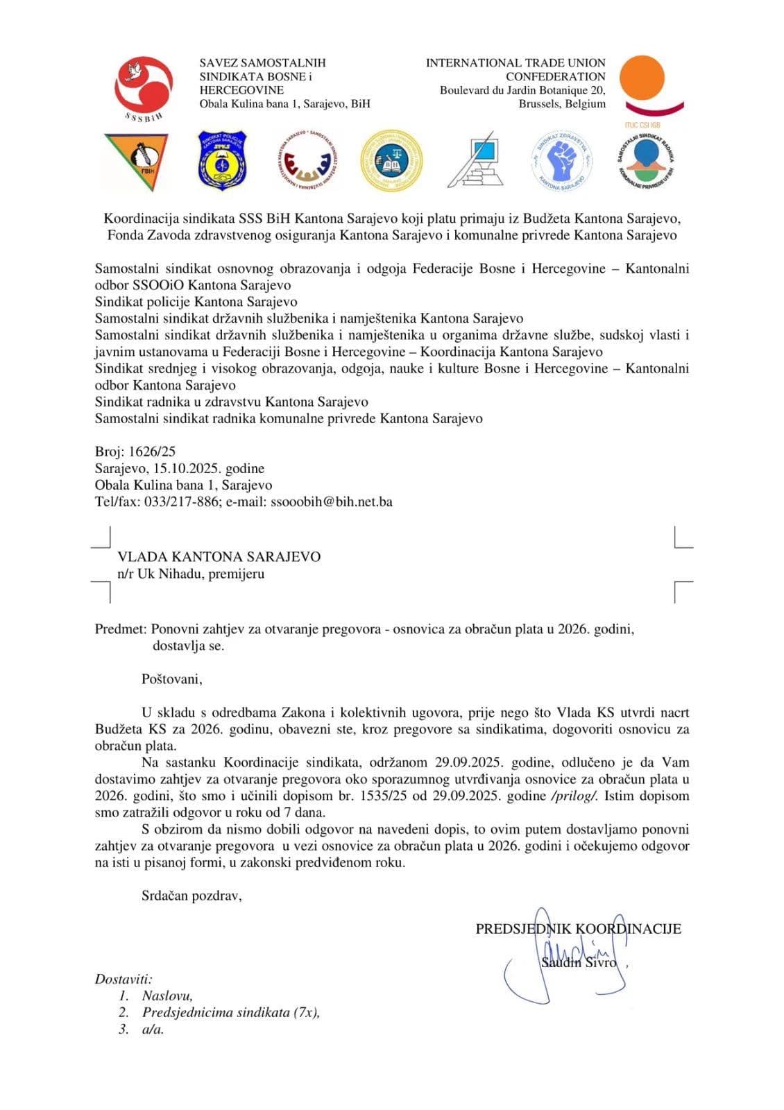 Koordinacija sindikata SSS BiH Kantona Sarajevo, koji plaću primaju iz budžeta KS, Zavoda zdravstvenog osiguranja KS i komunalne privrede KS uputila je novi dopis premijeru Nihadu Uku od kojeg su zatražili početak pregovora o visini osnovice za isplatu plaća u idućoj 2026. godine.