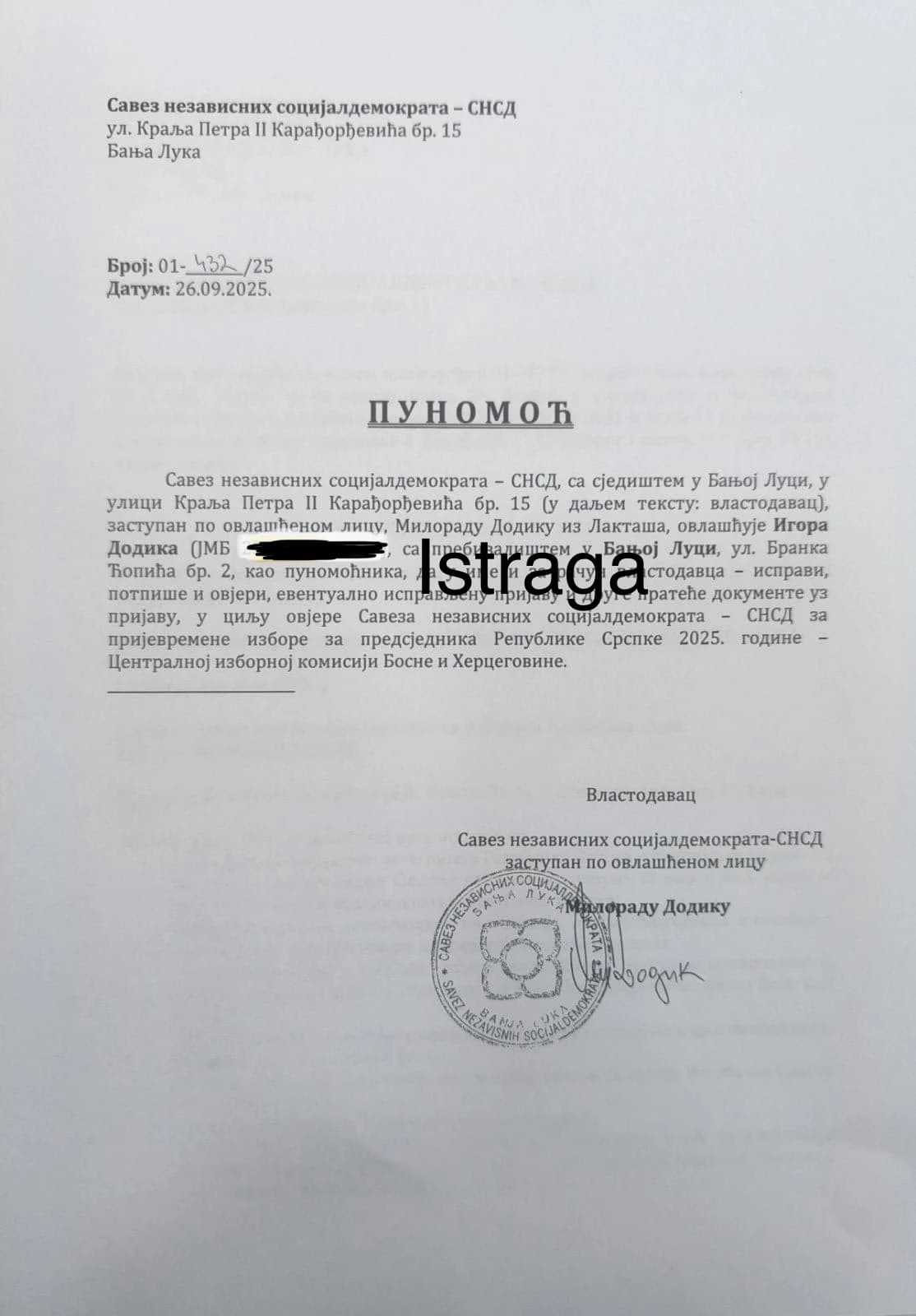 Srpske 2025. godine – Centralnoj izbornoj komisiji BiH - navedeno je u punomoći