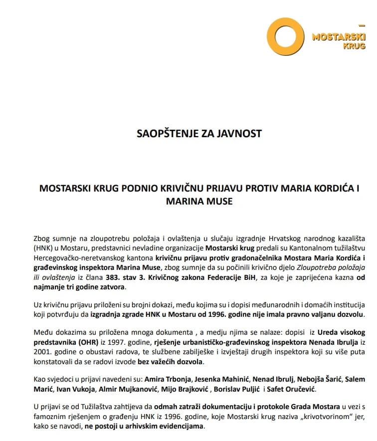 - Kao svjedoci u prijavi navedeni su: Amira Trbonja, Jesenka Mahinić, Nenad Ibrulj, Nebojša Šarić, Salem Marić, Ivan Vukoja, Almir Mujkanović, Mijo Brajković, Borislav Puljić i Safet Oručević. U prijavi se od Tužilaštva zahtijeva da odmah zatraži dokumentaciju i protokole Grada Mostara u vezi s famoznim rješenjem o građenju HNK iz 1996. godine, koje Mostarski krug naziva "krivotvorinom" jer, kako se navodi, ne postoji u arhivskim evidencijama.