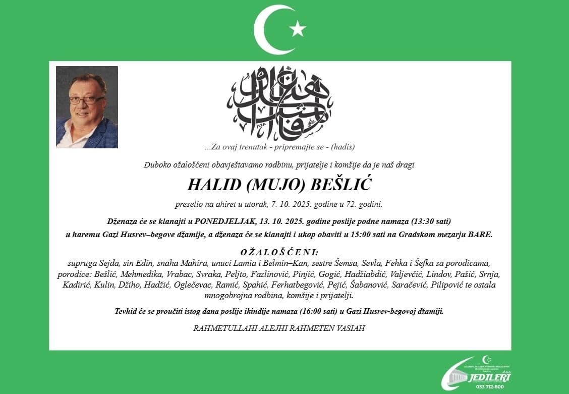 Dženaza Halidu Bešliću bit će klanjana u ponedjeljak nakon podne-namaza (u 13.30 sati), ispred Begove džamije u Sarajevu, potvrdila je porodica.