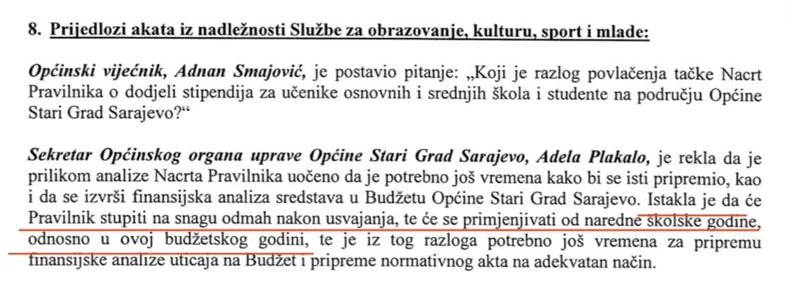 - Ovaj put je otišao i korak dalje, pa je ponizio i čitavo Općinsko vijeće koje ga je jednoglasno izglasanim zaključkom, još u maju, zadužilo da na usvajanje dostavi izmijenjeni ili novi Pravilnik o stipendiranju učenika i studenata iz Starog Grada, kako bi se doveli u ravnopravan položaj sa svojim školskim drugovima i kolegama studentima iz drugih, naročito gradskih, općina.