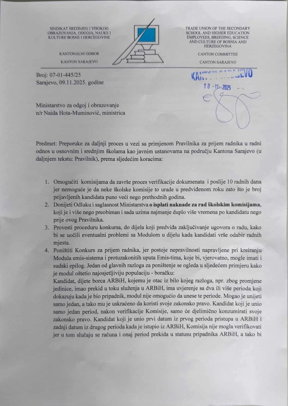 Sindikat srednjeg i visokog obrazovanja, odgoja, nauke i kulture Bosne i Hercegovine - Kantonalni odbor Kantona Sarajevo, uputio je Ministarstvu za odgoj i obrazovanje KS set preporuka u vezi sa aktuelnim konkursom za prijem radnika u osnovne i srednje škole na području Kantona Sarajevo.