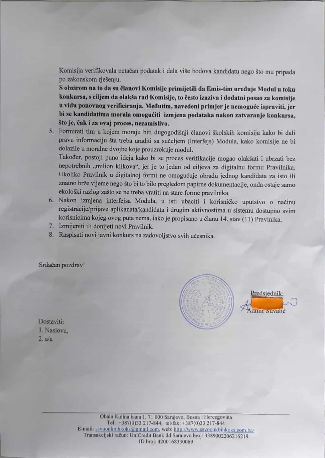 - Postoji puno ideja kako bi se proces verifikacije mogao olakšati i ubrzati bez nepotrebnih "milion klikova", jer je to jedan od ciljeva za digitalnu formu Pravilnika. Ukoliko Pravilnik u digitalnoj formi ne omogućuje obradu jednog kandidata za isto ili znatno brže vijeme nego što bi to bilo pregledom papirne dokumentacije, onda ostaje samo ekološki razlog zašto se ne treba vratiti na stare forme pravilnika. Nakon izmjena interfejsa Modula, u njega je potrebno ubaciti i korisničko uputstvo o načinu registracije/prijave aplikanata/kandidata i drugim aktivnostima u sistemu dostupno svim korisnicima kojeg ovog puta nema, iako je propisano u članu 14. stav (11) Pravinika. Tražimo i izmjenu ili donošenje novog Pravilnika kao i raspisivanje novog javni konkursa na zadovoljstvo svih učesnika - stoji u preporuci Sindikata.