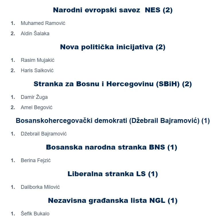 Najbrojnija je SDA s pet zastupnika. Novi početak imao je tri, sada ima jednog - Emira Hubjera, a preostala dva su ostala uz NiP. SDP je imao dva, od toga je jedan nezavisni. NES ima dva, Nova politička inicijativa dva, a po jednog imaju Bh. demokrati-Džebrail Bajramović, BNS, Liberalna stranka, NGL, SBB i DF.