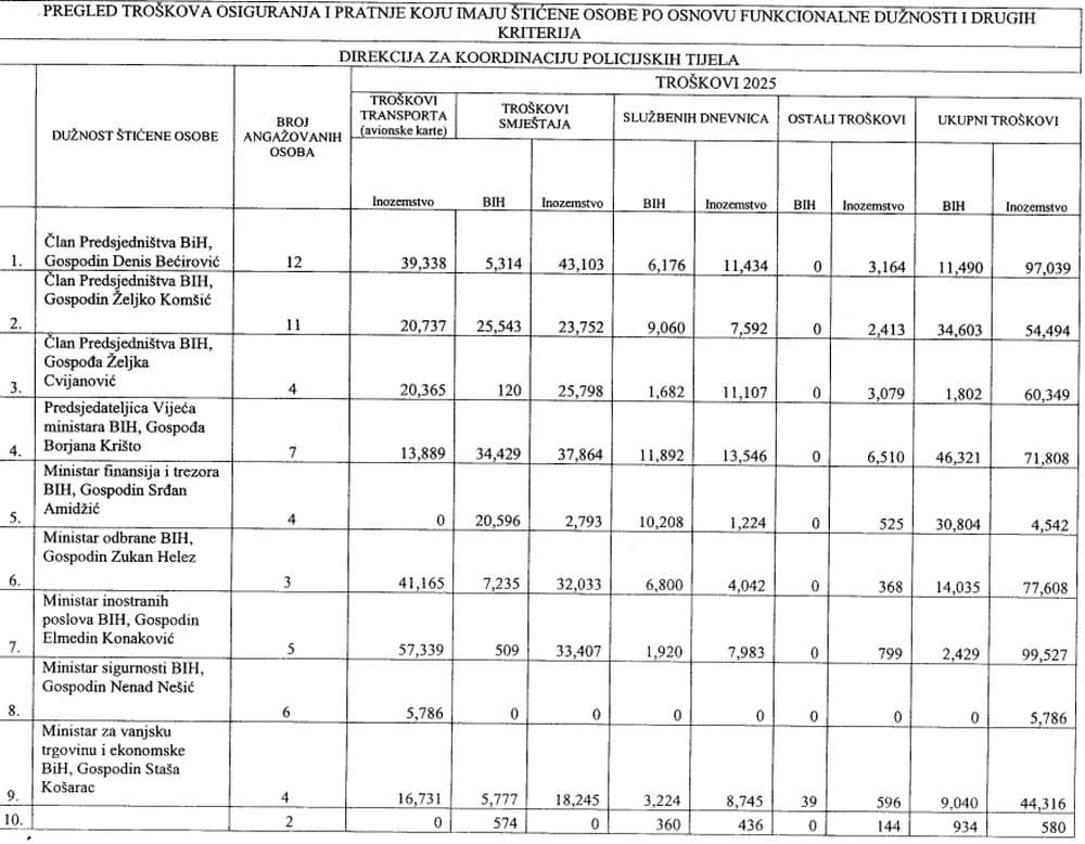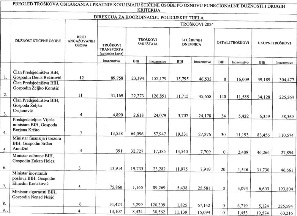 Za osiguranje i pratnju funkcionera i drugih štićenih osoba na nivou Bosne i Hercegovine u prošloj je godini potrošeno više od 2,3 miliona KM, a u prvih šest mjeseci ove godine nešto više od milion, što je za godinu i po skoro 3,4 miliona KM troškova.