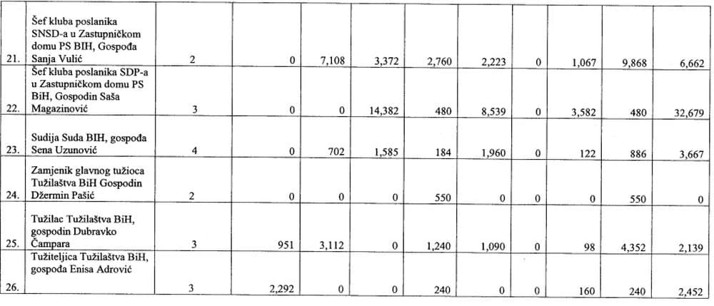 Borjana Krišto kao predsjedavajuća Vijeća ministara Bosne i Hercegovine ima sedam "zaštitara", zamjenik predsjedavajućeg Zastupničkog doma Parlamentarne skupštine Bosne i Hercegovione Denis Zvizdić ima pet, a predsjedavajući zastupnikog doma Marinko Čavara kao i zamjenik predsjedavajućeg Doma naroda Dragan Čović imaju po četiri. Darko Babalj, zamjenik predsjedavajućeg Zastupničkokg doma, ima dva, dok "ostatak" kolegija Doma naroda, odnosno Nikola Špirić i Kemal Ademović nisu imali nijednog.