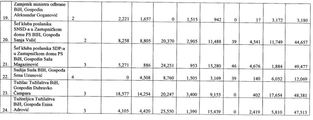 Najveći broj osoba u pratnji i osiguranju ima član Predsjedništva Bosne i Hercegovine Denis Bećirović, njih 12, slijedi predsjedavajući Predsjedništva BiH Željko Komšić s 11, dok članica Predsjedništva BiH Željka Cvijanović ima četiri osobe u pratnji i osiguranju.