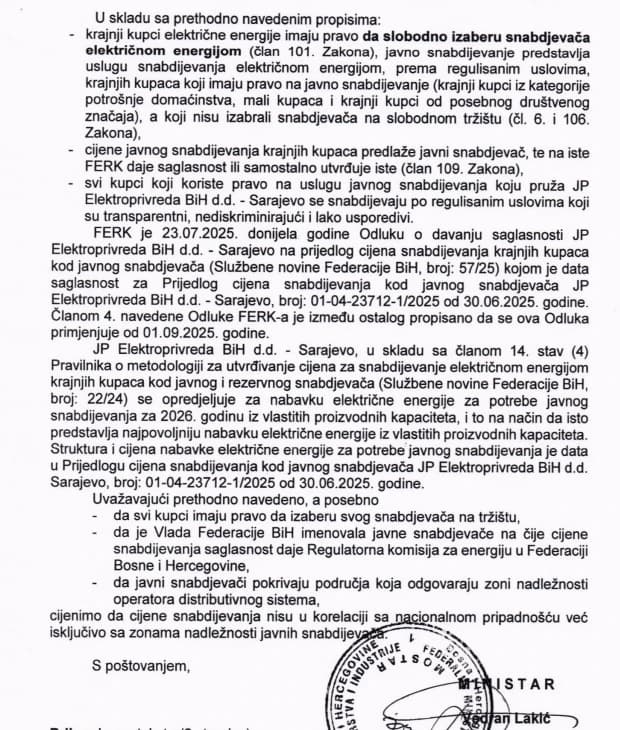 Cijenimo da cijene snabdijevanja nisu u korelaciji sa nacionalnom pripadnošću već isključivo sa zonama nadležnosti snabdijevanja - stoji u odgovoru zastupnici Mahmutbegović koji potpisuje ministar Vedran Lakić.