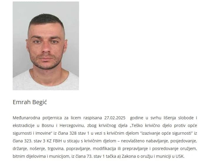 Emraha Begića iz Velike Kladuše traži Općinski sud u tom gradu, a zbog teškog krivičnog djela protiv opće sigurnosti ljudi i imovine, u vezi sa izazivanjem opće opasnosti i nedozvoljenim držanjem i nošenjem oružja i municije.