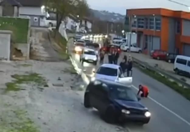 Dok je vozač na asfaltu, u auto utrčava njegov raniji suvozač, koji okreće automobil i velikom brzinom ga usmjerava prema ljudima koji stoje oko vozila. Navodno je riječ o maloljetniku.