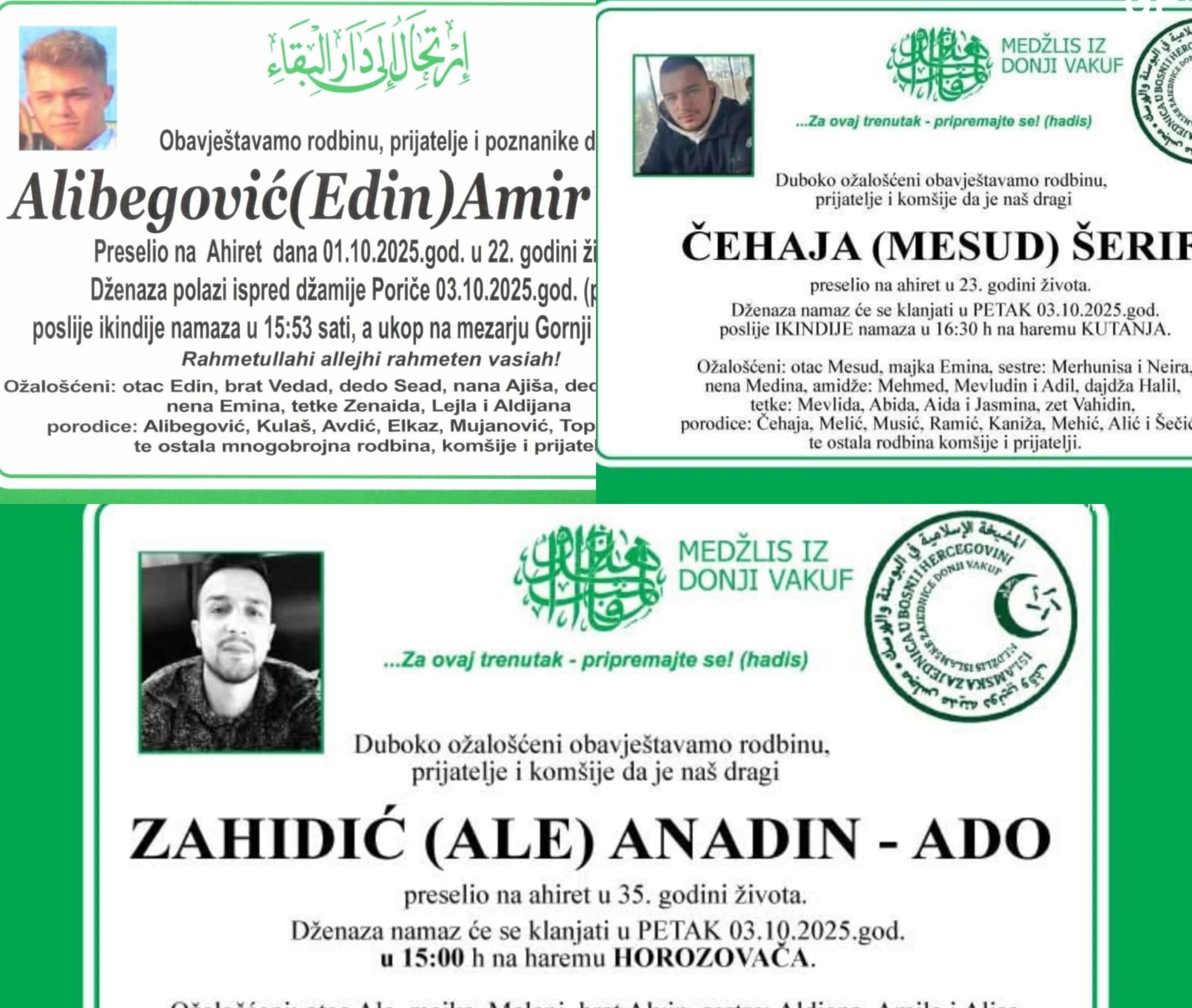 Kako je objavljeno na društvenim mrežama, sve trojici poginulih mladića će sutra biti klanjane dženaze i obavljen ukop - Alibegoviću na mezarju Gornji Alibegovići - Bugojno, Čehaji u haremu Kutanja - Donji Vakuf, a Zahidiću u haremu Horozovača - Donji Vakuf.