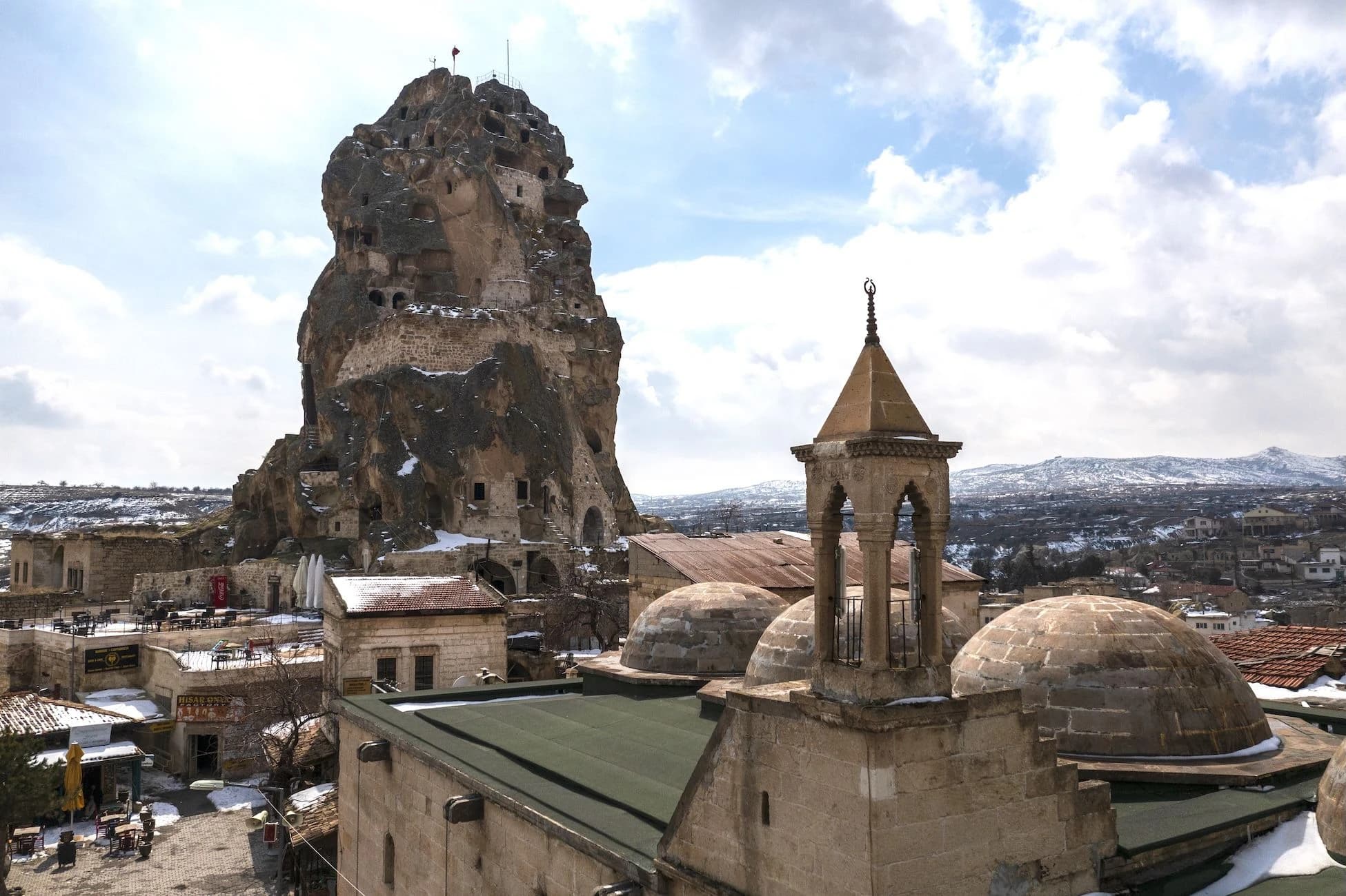 U srcu grada uzdiže se dvorac Ortahisar – visoki vilinski dimnjak. Smatra se da je isklesan još u hetitskom periodu, a dvorac sadrži pećine, golubarnike i labirintne tunele te se smatra jednom od prvih višespratnih naselja na svijetu. Danas je jedan od najviših vidikovaca u regiji, nudeći spektakularne panoramske prizore.