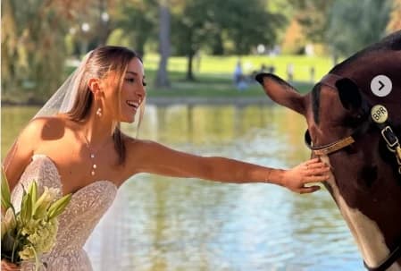 Uz nju stoji mladoženja u elegantnom bež odijelu, a u jednom trenutku Ema s osmijehom nježno dodiruje konja na kojem sjedi policajac.