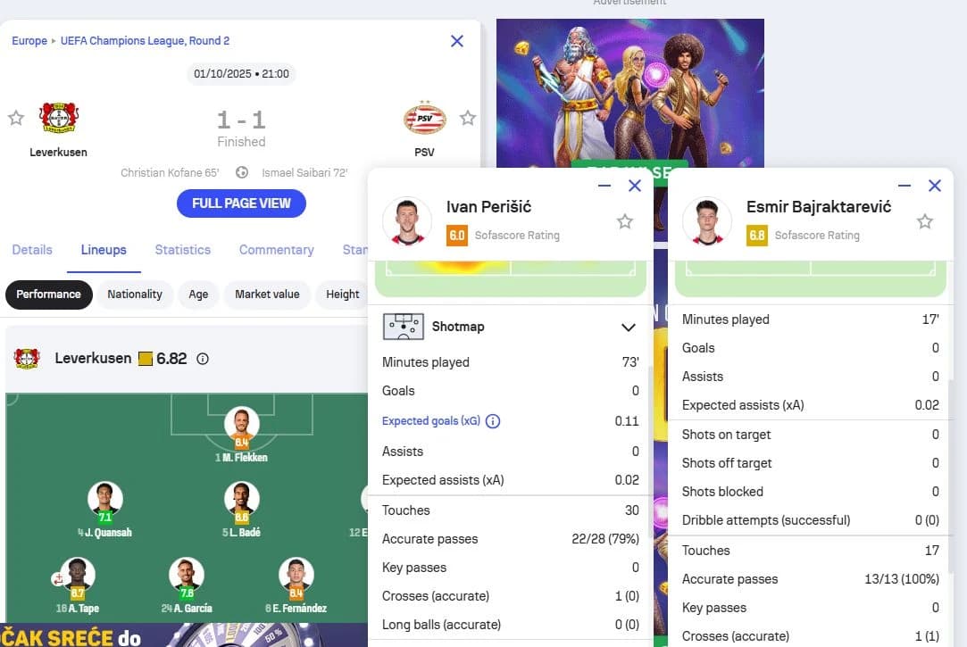 Na platformi SofaScore dobio je ocjenu 6,8, što je bolja ocjena od više od polovine njegovih igrača. Od 14 fudbalera PSV-a koji su sinoć nastupili njih peterica bolje su ocijenjeni.
