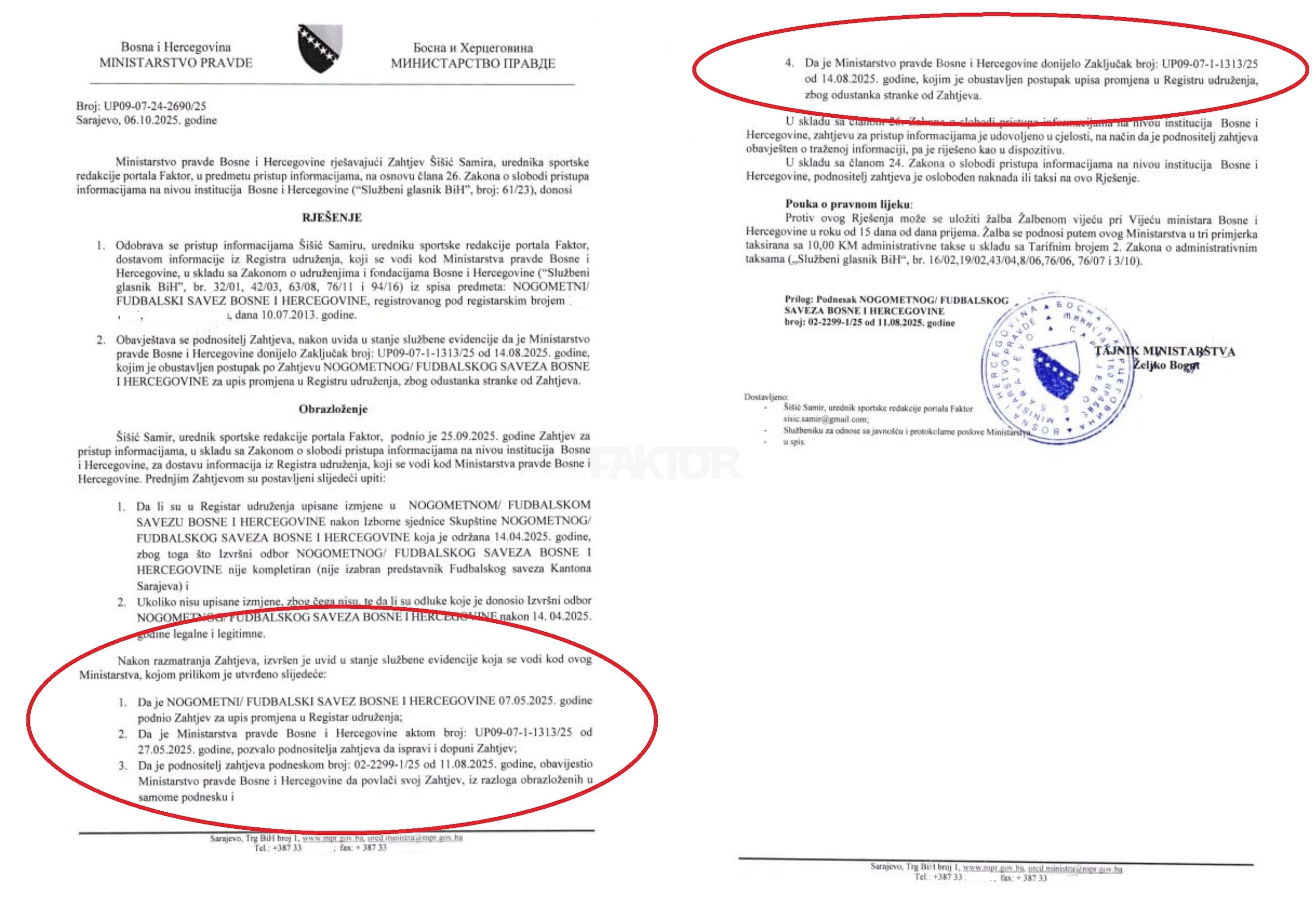 Fudbalski savez Bosne i Hercegovine nije upisao izmjene u Registar udruženja kod Ministarstva pravde Bosne i Hercegovine, ekskluzivno je potvrđeno za Faktor!