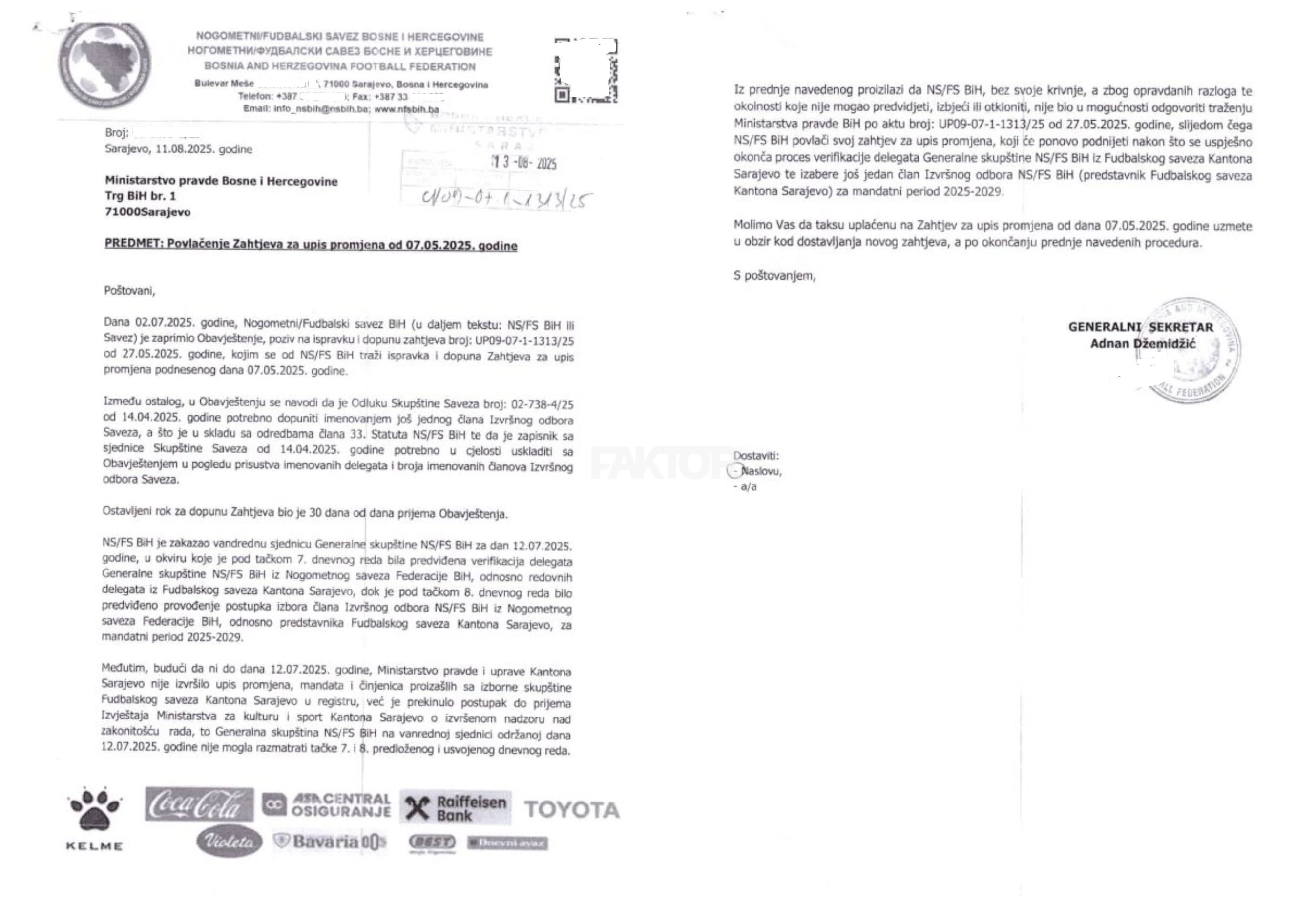 FSBiH, bez svoje krivnje, a zbog opravdanih razloga te okolnosti koje nije mogao predvidjeti, izbjeći ili otkloniti, nije bio u mogućnosti odgovoriti traženju Ministarstva pravde BiH po aktu broj: UP09-07-1-1313/25 od 27. maja 2025. godine, slijedom čega FSBiH povlači svoj zahtjev za upis promjena, koji će ponovo podnijeti nakon što se uspješno okonča proces verifikacije delegata Generalne skupštine FSBiH iz FSKS te izabere još jedan član Izvršnog odbora FSBiH (predstavnik FSKS) za mandatni period 2025-2029 - piše u dopisu kojeg je potpisao generalni sekretar FSBiH Adnan Džemidžić.