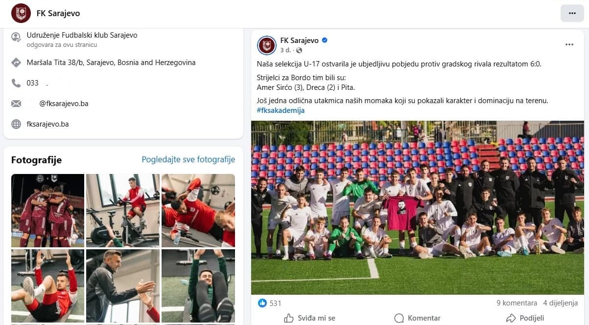 - Naša selekcija U-17 ostvarila je ubjedljivu pobjedu protiv gradskog rivala rezultatom 6:0. Strijelci za Bordo tim bili su: Amer Sirćo (3), Dreca (2) i Pita. Još jedna odlična utakmica naših momaka koji su pokazali karakter i dominaciju na terenu - objavilo je FK Sarajevo na Facebooku nakon što su kadeti savladali vršnjake iz Željezničara sa 6:0.
