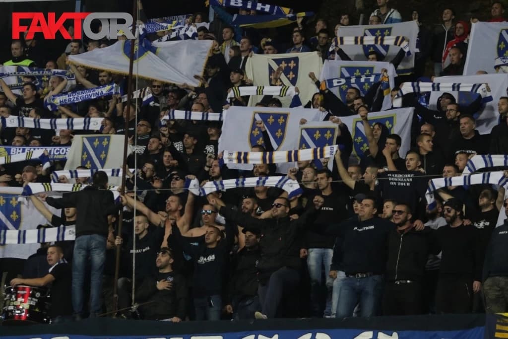 Nekoliko stotina navijača sa obilježjima naše zemlje zauzeli su svoje mjesto na tribinama, a prilikom intoniranja himne BiH, s tribina je, po običaju otpjevana, "Jedna si jedina".
