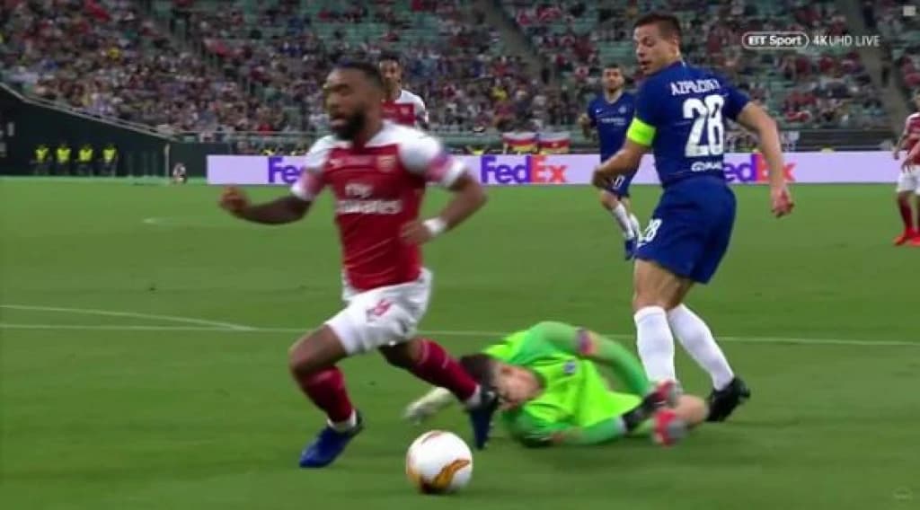 Francuski napadač Alexandre Lacazette pao u šesnaestercu poslije intervencije Kepe. Golman Chelseaja krenuo je na jednu loptu u pokušaju da spriječi Francuza da to učini prije njega, ali nije uspio. Evidentno je da ga je rukama zakačio po skočni zglobovima, no sudija se nije oglasio.