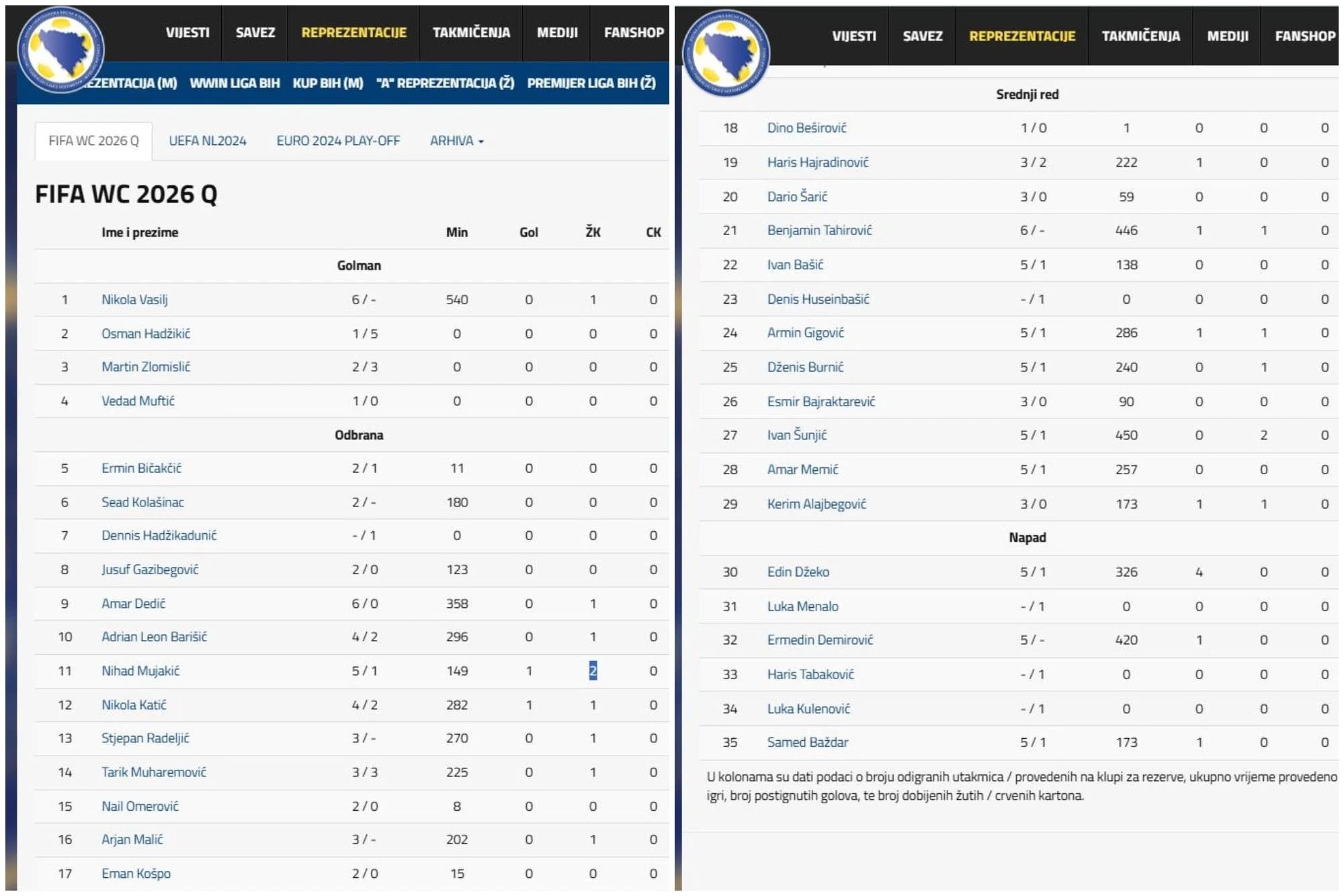 Adrian Leon Barišić (296), Nikola Katić (282), a po tri: Stjepan Radeljić (270), Tarik Muharemović (225), Haris Hajradinović (222), Arjan Malić (202), Kerim Alajbegović (173), Dario Šarić (59), Esmir Bajraktarević (90).