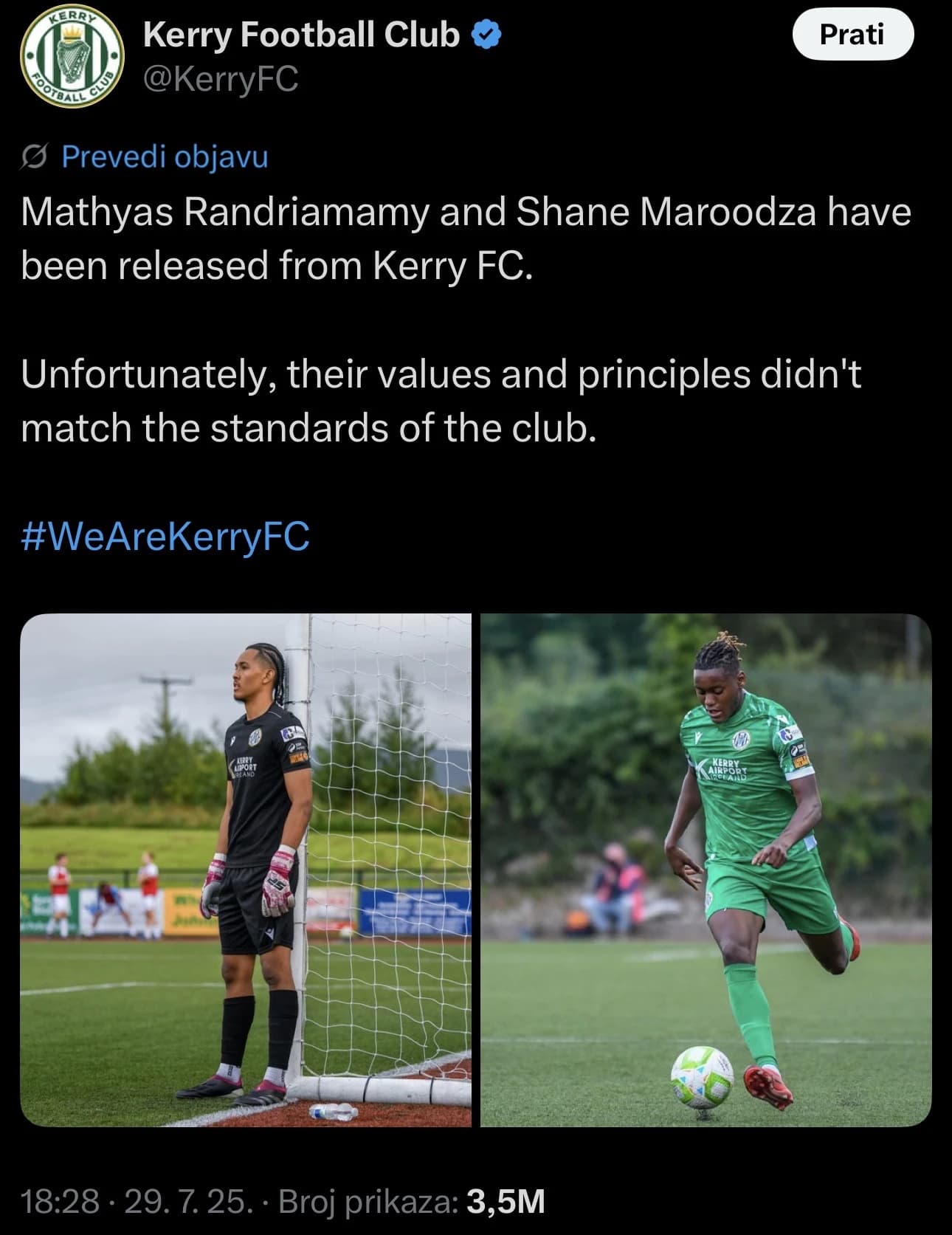 No, prva utakmica za Kerry bila mu je i posljednja. Irski klub objavio je da je fudbaler otpušten poslije svega četiri dana angažmana.