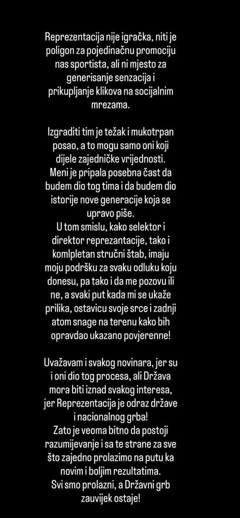 - Reprezentacija nije igračka niti je poligon za pojedinačnu promociju nas sportista, ali ni mjesto za generisanje senzacija i prikupljanje klikova na socijalnim mrežama.