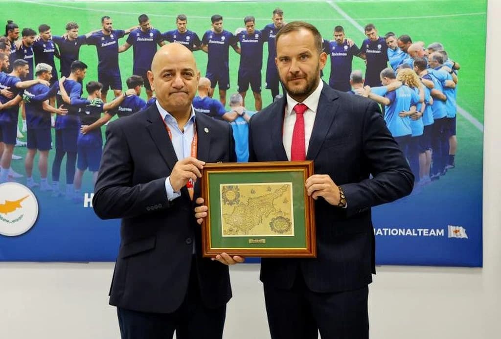 Zeljkovića je dočekao predsjednik Fudbalskog saveza Kipra Haris Loizides, te su dva predsjednika razmijenili