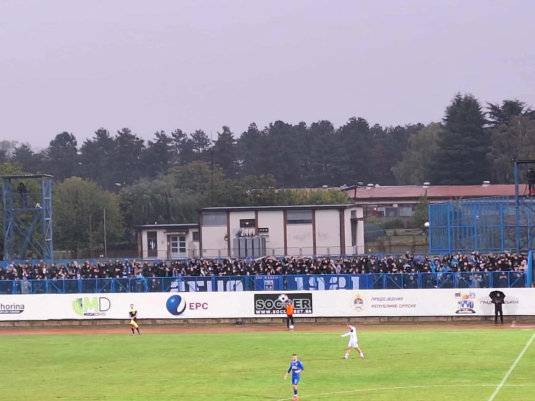 Kraj prvog dijela. Gostujući fudbaleri imaju i podršku navijača, koji su "zagrmili" tek u finišu prvog dijela, kada su se smjestili na tribinu namijenjenu gostujućim navijačima.