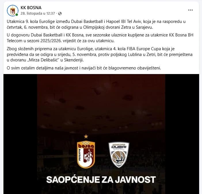 - U dogovoru Dubai Basketball i KK Bosna, sve sezonske ulaznice kupljene za utakmice KK Bosna u sezoni 2025/2026 vrijedit će za ovu utakmicu - ranije je saopćila KK Bosna.